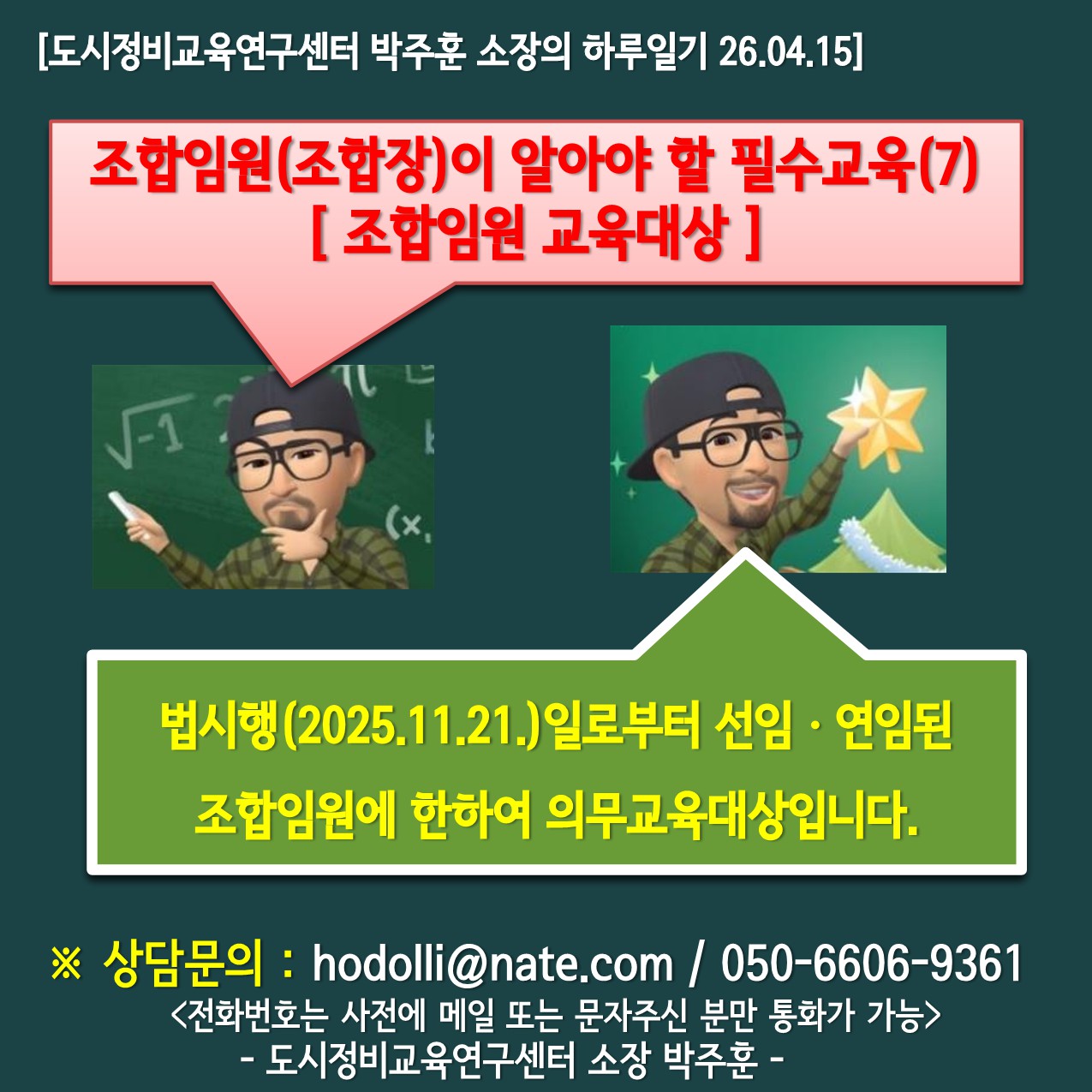2025년부터 달라지는 조합임원 교육제도, 대상자 기준 한눈에 법시행(2025.11.21.)일로부터 선임ㆍ연임된 조합임원에 한하여 의무교육대상입니다. 알기 쉬운 정비사업배움 박주훈소장 비공개 1:1 질문을 할 수 있는 엑스퍼트로 활동중! (2025.07~) 지식 거래 상담 전문가 활동중 도시정비교육연구센터 https://blog.naver.com/korhodolli 정비사업관련 2026.04.16
